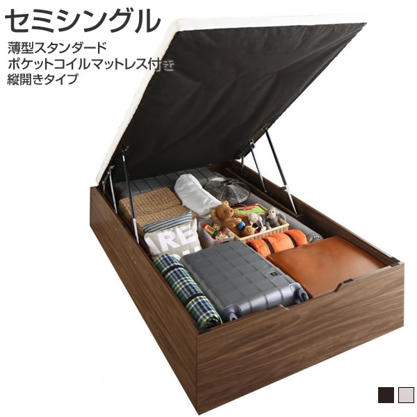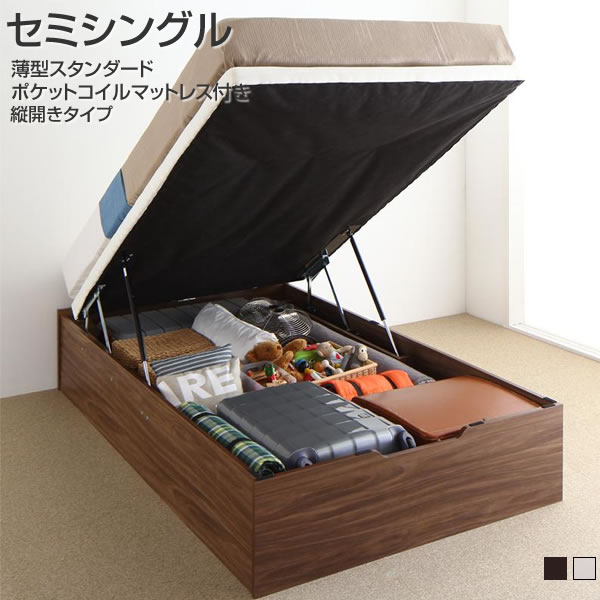 組立設置付 ヘッドレスベッド 跳ね上げ式 セミシングル 縦開き セミシングルベッド ヘッドレス ベッド マットレス付き 跳ね上げベッド 収納ベッド 小さい 小さめ すのこベッド 大容量 幅が狭い 布団収納 敷布団可能 ガス圧式 薄型スタンダードポケットコイルマットレス付き